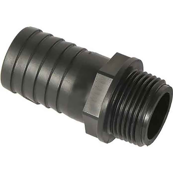 -Priključak za crevo sa spoljašnjim navojem napravljen od plastike.